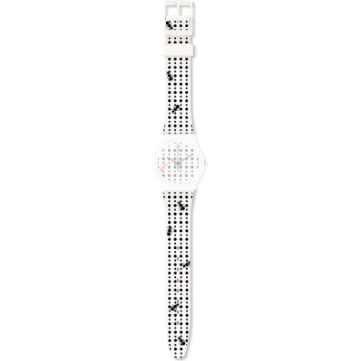 This Swatch watch strap is made of silicone and is attached to the watch by means of steel pins. The band has a width of 17 mm and is closed by means of a buckle. The strap has no straight mount which means that this strap is only suitable for the watches listed below.