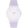 This Swatch watch strap is made of silicone and is attached to the watch by means of steel pins. The band has a width of 19.7 mm and is closed by means of a buckle. The strap has no straight mount which means that this strap is only suitable for the watches listed below.