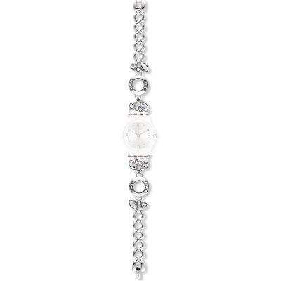 This Swatch watch strap is made of stainless steel and is attached to the watch by means of steel pins. The band has a width of 12 mm and is closed by means of a jewelry clasp. The strap has no straight mount which means that this strap is only suitable for the watches listed below.