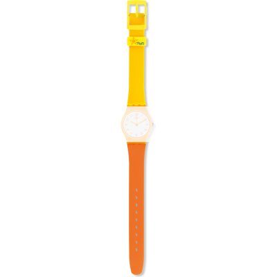 This Swatch watch strap is made of plastic/Resin and is attached to the watch by means of steel pins. The band has a width of 12 mm and is closed by means of a buckle. The strap has no straight mount which means that this strap is only suitable for the watches listed below.