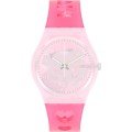 This Swatch watch strap is made of silicone and is attached to the watch by means of steel pins. The band has a width of 17 mm and is closed by means of a buckle. The strap has no straight mount which means that this strap is only suitable for the watches listed below.