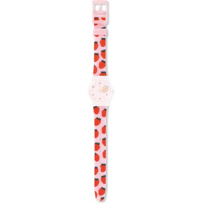 This Swatch watch strap is made of silicone and is attached to the watch by means of steel pins. The band has a width of 12 mm and is closed by means of a buckle. The strap has no straight mount which means that this strap is only suitable for the watches listed below.