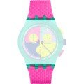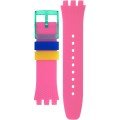 This Swatch watch strap is made of silicone and is attached to the watch by means of steel pins. The band has a width of 20.1 mm and is closed by means of a buckle. The strap has no straight mount which means that this strap is only suitable for the watches listed below.