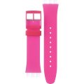 This Swatch watch strap is made of silicone and is attached to the watch by means of steel pins. The band has a width of 19.7 mm and is closed by means of a buckle. The strap has no straight mount which means that this strap is only suitable for the watches listed below.