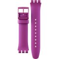 This Swatch watch strap is made of silicone and is attached to the watch by means of steel pins. The band has a width of 19.7 mm and is closed by means of a buckle. The strap has no straight mount which means that this strap is only suitable for the watches listed below.