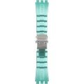 This Swatch watch strap is made of plastic/Resin and is attached to the watch by means of steel pins. The band has a width of 23 mm and is closed by means of a deployment clasp with push buttons and safety. The strap has no straight mount which means that this strap is only suitable for the watches listed below.