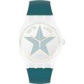 This Swatch watch strap is made of silicone and is attached to the watch by means of steel pins. The band has a width of 19.7 mm and is closed by means of a buckle. The strap has no straight mount which means that this strap is only suitable for the watches listed below.