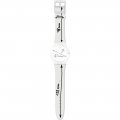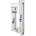 This Swatch watch strap is made of silicone and is attached to the watch by means of steel pins. The band has a width of 19.7 mm and is closed by means of a buckle. The strap has no straight mount which means that this strap is only suitable for the watches listed below.