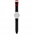 This Swatch watch strap is made of silicone and is attached to the watch by means of steel pins. The band has a width of 19.8 mm and is closed by means of a buckle. The strap has no straight mount which means that this strap is only suitable for the watches listed below.