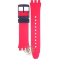 This Swatch watch strap is made of silicone and is attached to the watch by means of steel pins. The band has a width of 19.8 mm and is closed by means of a buckle. The strap has no straight mount which means that this strap is only suitable for the watches listed below.