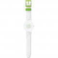 This Swatch watch strap is made of silicone and is attached to the watch by means of steel pins. The band has a width of 21.3 mm and is closed by means of a buckle. The strap has no straight mount which means that this strap is only suitable for the watches listed below.