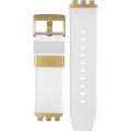 This Swatch watch strap is made of silicone and is attached to the watch by means of steel pins. The band has a width of 19.7 mm and is closed by means of a buckle. The strap has no straight mount which means that this strap is only suitable for the watches listed below.