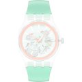 This Swatch watch strap is made of silicone/Rubber and is attached to the watch by means of steel pins. The band has a width of 19.7 mm and is closed by means of a buckle. The strap has no straight mount which means that this strap is only suitable for the watches listed below.