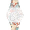 This Swatch watch strap is made of plastic/Resin and is attached to the watch by means of steel pins. The band has a width of 19.7 mm and is closed by means of a buckle. The strap has no straight mount which means that this strap is only suitable for the watches listed below.