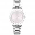 This Swatch watch strap is made of stainless steel and is attached to the watch by means of steel pins. The band has a width of 17 mm and is closed by means of a deployment clasp with push buttons and safety. The strap has no straight mount which means that this strap is only suitable for the watches listed below.