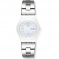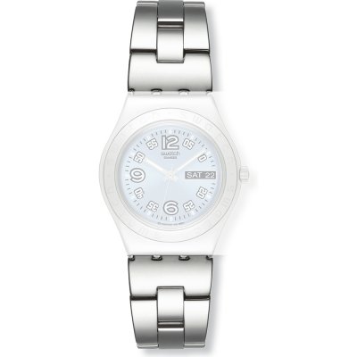 This Swatch watch strap is made of stainless steel and is attached to the watch by means of steel pins. The band has a width of 17 mm and is closed by means of a deployment clasp with push buttons and safety. The strap has no straight mount which means that this strap is only suitable for the watches listed below.