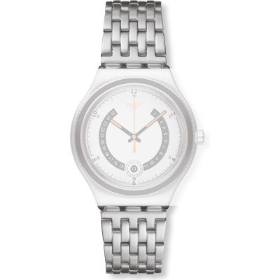 This Swatch watch strap is made of stainless steel and is attached to the watch by means of steel pins. The band has a width of 18.9 mm and is closed by means of a deployment clasp with safety. The strap has no straight mount which means that this strap is only suitable for the watches listed below.
