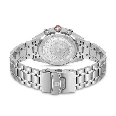 This Swiss Military Hanowa watch has a case made of stainless steel with a diameter of 44 mm and is fitted with a stainless steel band. Inside the case lies a Ronda movement and the watch features a Sapphire crystal.
