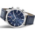This Swiss Military Hanowa watch has a case made of stainless steel with a diameter of 44 mm and is fitted with a leather band. Inside the case lies a ISA movement and the watch features a Sapphire crystal.
