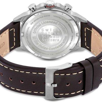 This Swiss Military Hanowa watch has a case made of stainless steel with a diameter of 45 mm and is fitted with a leather band. Inside the case lies a Ronda movement and the watch features a Sapphire crystal.