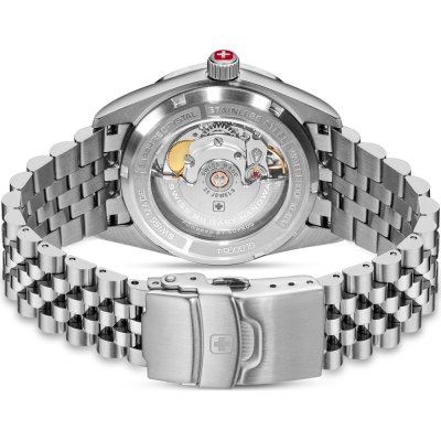 This Swiss Military Hanowa watch has a case made of stainless steel with a diameter of 41 mm and is fitted with a stainless steel band. Inside the case lies a Soprod movement and the watch features a Sapphire crystal.