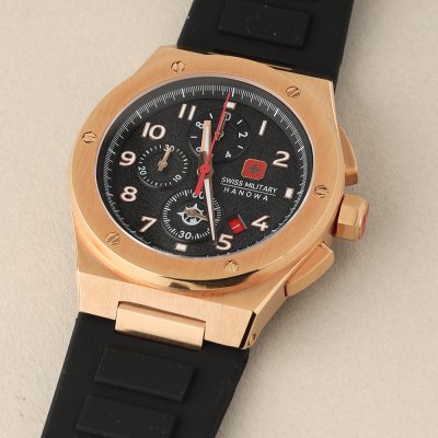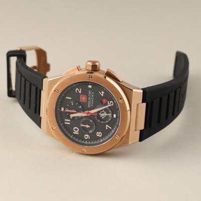 This Swiss Military Hanowa watch has a case made of stainless steel with a diameter of 43 mm and is fitted with a rubber band. Inside the case lies a Ronda movement and the watch features a Sapphire crystal.