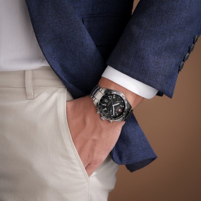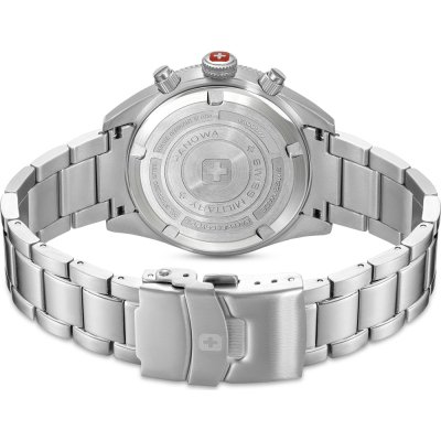 This Swiss Military Hanowa watch has a case made of stainless steel with a diameter of 43 mm and is fitted with a stainless steel band. Inside the case lies a Ronda movement and the watch features a Sapphire crystal.
