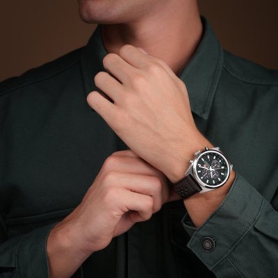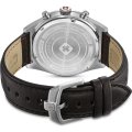 This Swiss Military Hanowa watch has a case made of stainless steel with a diameter of 43 mm and is fitted with a leather band. Inside the case lies a Ronda movement and the watch features a Sapphire crystal.