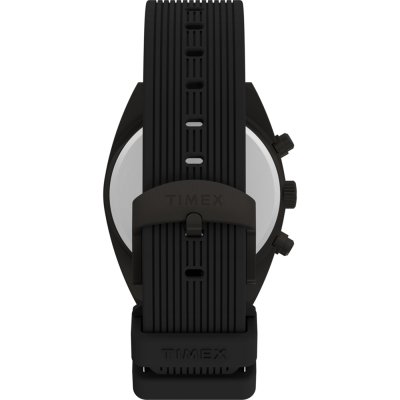 This Timex watch has a case made of stainless steel with a diameter of 41 mm and is fitted with a rubber band. Inside the case lies a Timex movement and the watch features a Mineral crystal.