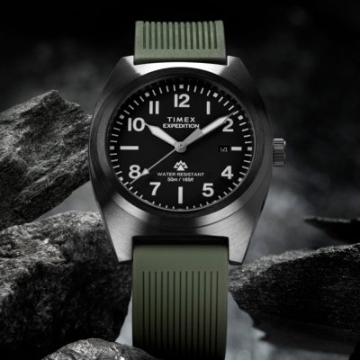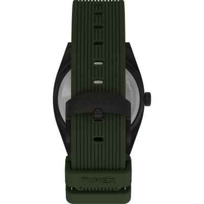 This Timex watch has a case made of metal alloy with a diameter of 39 mm and is fitted with a rubber band. Inside the case lies a Timex movement and the watch features a Mineral crystal.