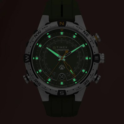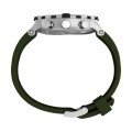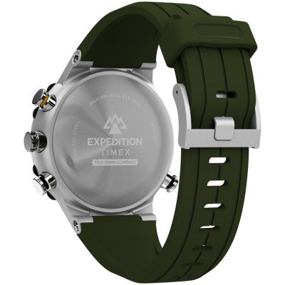This Timex watch has a case made of stainless steel with a diameter of 45 mm and is fitted with a rubber band. Inside the case lies a Timex movement and the watch features a Mineral crystal.