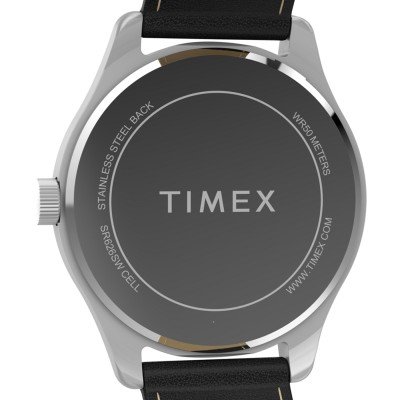 This Timex watch has a case made of metal alloy with a diameter of 42 mm and is fitted with a leather band. Inside the case lies a Timex movement and the watch features a Mineral crystal.