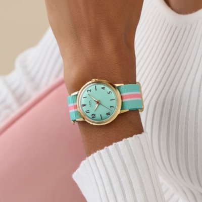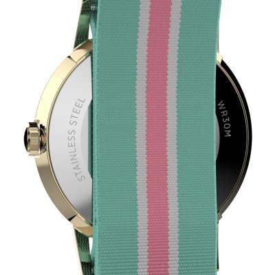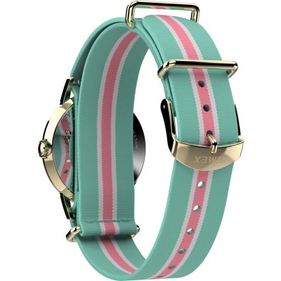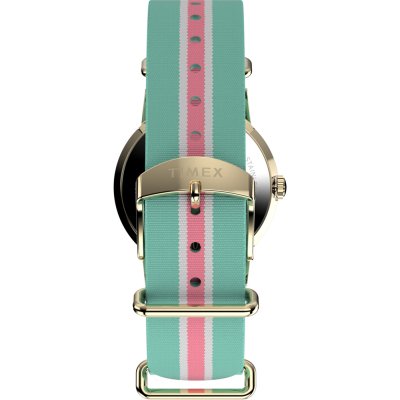 This Timex watch has a case made of stainless steel with a diameter of 34 mm and is fitted with a textile band. Inside the case lies a Timex movement and the watch features a Acrylic crystal.