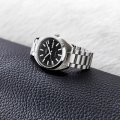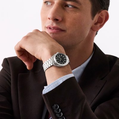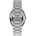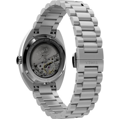 This Timex watch has a case made of stainless steel with a diameter of 37 mm and is fitted with a stainless steel band. Inside the case lies a Timex movement and the watch features a Mineral crystal.
