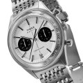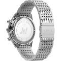 This Timex watch has a case made of stainless steel with a diameter of 40 mm and is fitted with a stainless steel band. Inside the case lies a Timex movement and the watch features a Hesalite crystal.