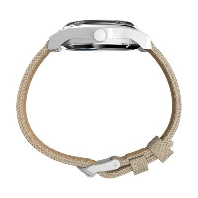 This Timex watch has a case made of stainless steel with a diameter of 40 mm and is fitted with a Textile over leather band. Inside the case lies a Timex movement and the watch features a Acrylic crystal.