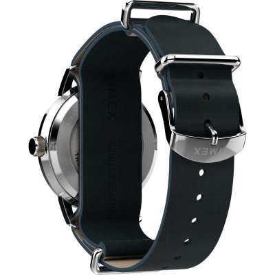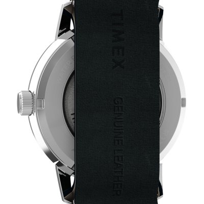 This Timex watch has a case made of stainless steel with a diameter of 40 mm and is fitted with a leather band. Inside the case lies a Timex movement and the watch features a Acrylic crystal.