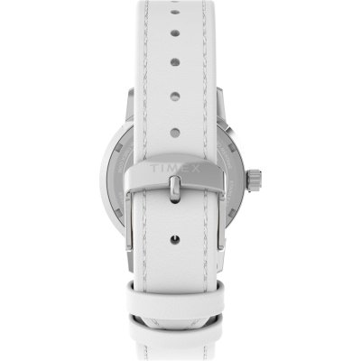 This Timex watch has a case made of stainless steel with a diameter of 38 mm and is fitted with a leather band. Inside the case lies a Timex movement and the watch features a Acrylic crystal.