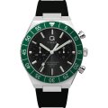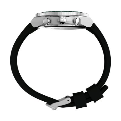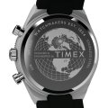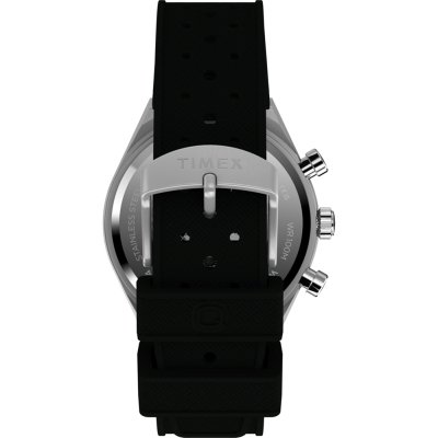 This Timex watch has a case made of stainless steel with a diameter of 40 mm and is fitted with a rubber band. Inside the case lies a Timex movement and the watch features a Mineral crystal.