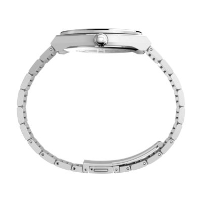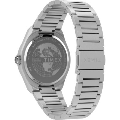 This Timex watch has a case made of stainless steel with a diameter of 39 mm and is fitted with a stainless steel band. Inside the case lies a Timex movement and the watch features a Mineral crystal.