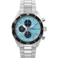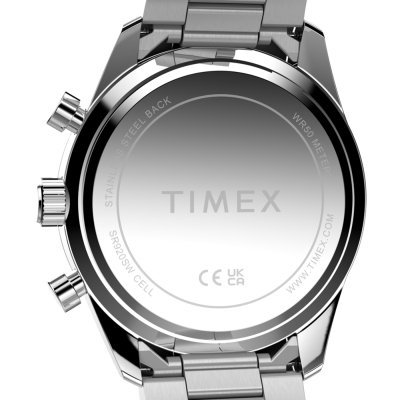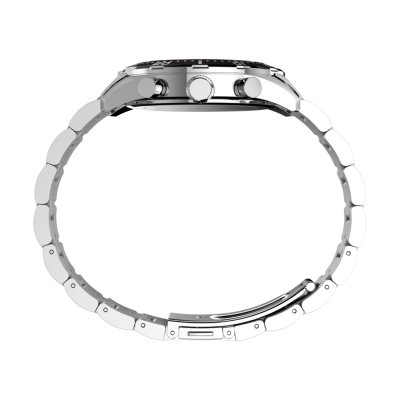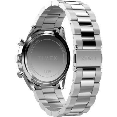 This Timex watch has a case made of stainless steel with a diameter of 42 mm and is fitted with a stainless steel band. Inside the case lies a Timex movement and the watch features a Mineral crystal.