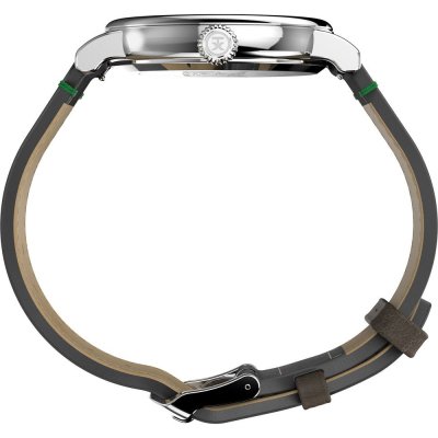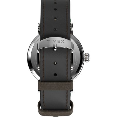 This Timex watch has a case made of metal alloy with a diameter of 40 mm and is fitted with a leather band. Inside the case lies a Timex movement and the watch features a Mineral crystal.