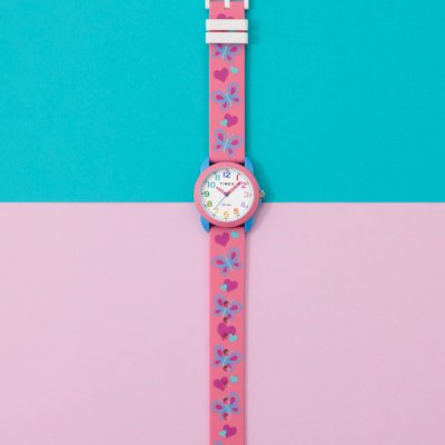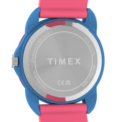 This Timex watch has a case made of Resin with a diameter of 30 mm and is fitted with a rubber band. Inside the case lies a Timex movement and the watch features a Acrylic crystal.
