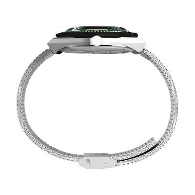 This Timex watch has a case made of stainless steel with a diameter of 38 mm and is fitted with a stainless steel band. Inside the case lies a Timex movement and the watch features a Acrylic crystal.
