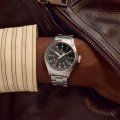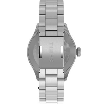This Timex watch has a case made of stainless steel with a diameter of 41 mm and is fitted with a stainless steel band. Inside the case lies a Timex movement and the watch features a Mineral crystal.