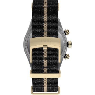 This Timex watch has a case made of stainless steel with a diameter of 39 mm and is fitted with a textile band. Inside the case lies a Timex movement and the watch features a Mineral crystal.