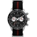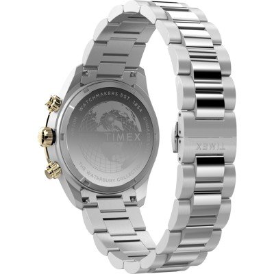 This Timex watch has a case made of stainless steel with a diameter of 39 mm and is fitted with a stainless steel band. Inside the case lies a Timex movement and the watch features a Mineral crystal.