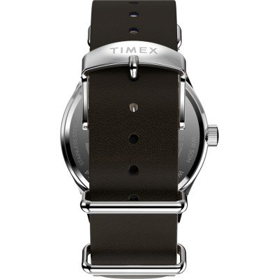 This Timex watch has a case made of stainless steel with a diameter of 39 mm and is fitted with a leather band. Inside the case lies a Timex movement and the watch features a Mineral crystal.