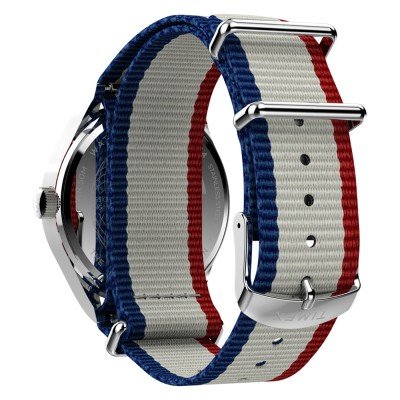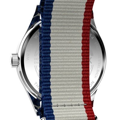 This Timex watch has a case made of stainless steel with a diameter of 39 mm and is fitted with a textile band. Inside the case lies a Timex movement and the watch features a Mineral crystal.