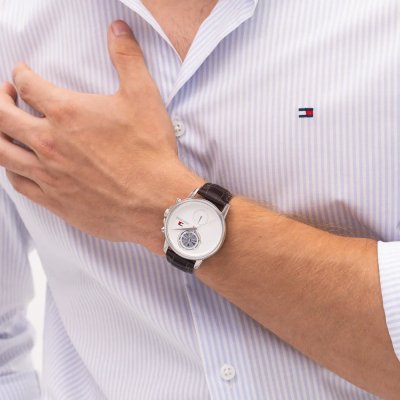 This Tommy Hilfiger watch has a case made of stainless steel with a diameter of 40 mm and is fitted with a leather band. Inside the case lies a Seiko Instruments Inc. movement and the watch features a Mineral crystal.
